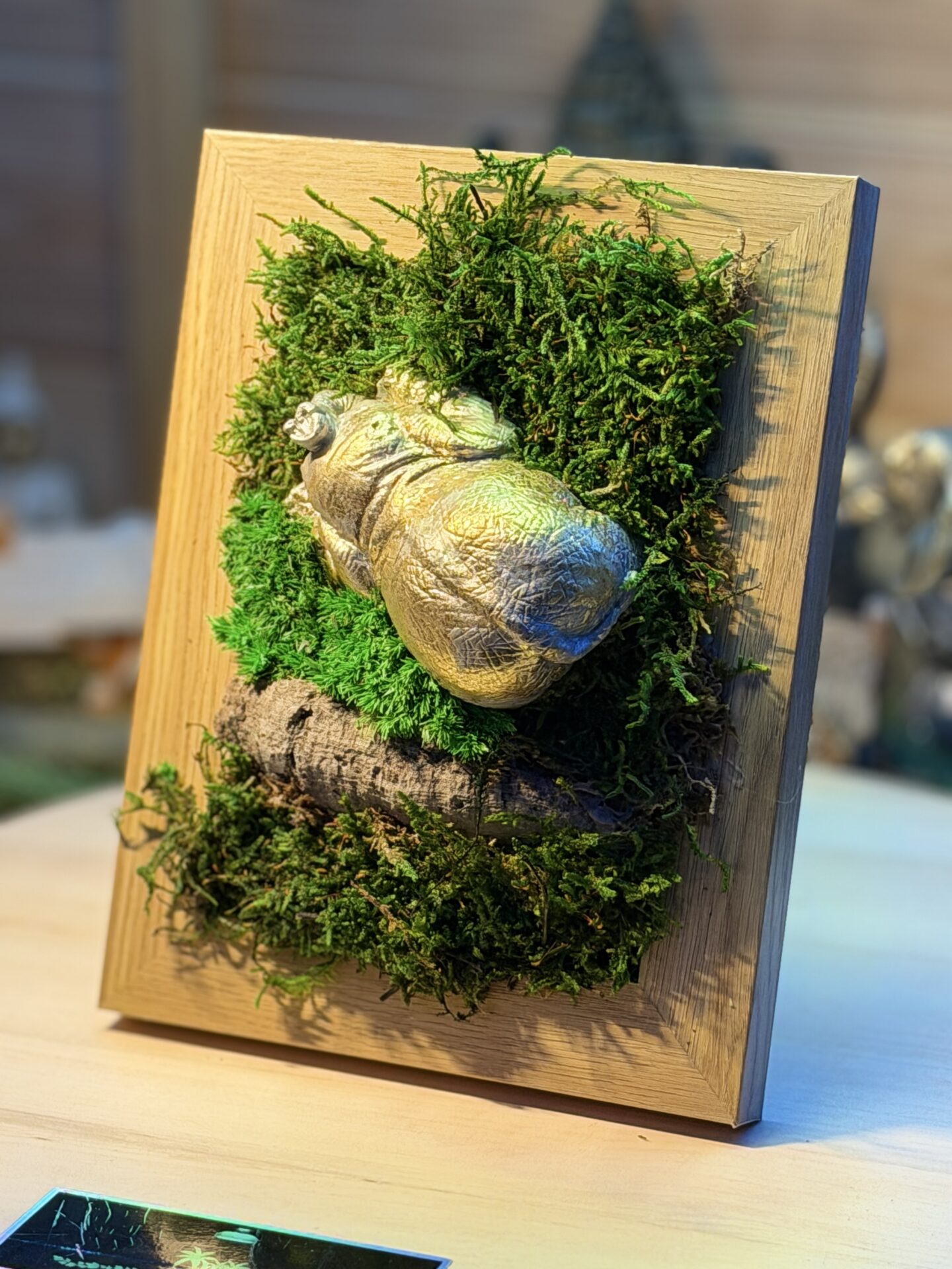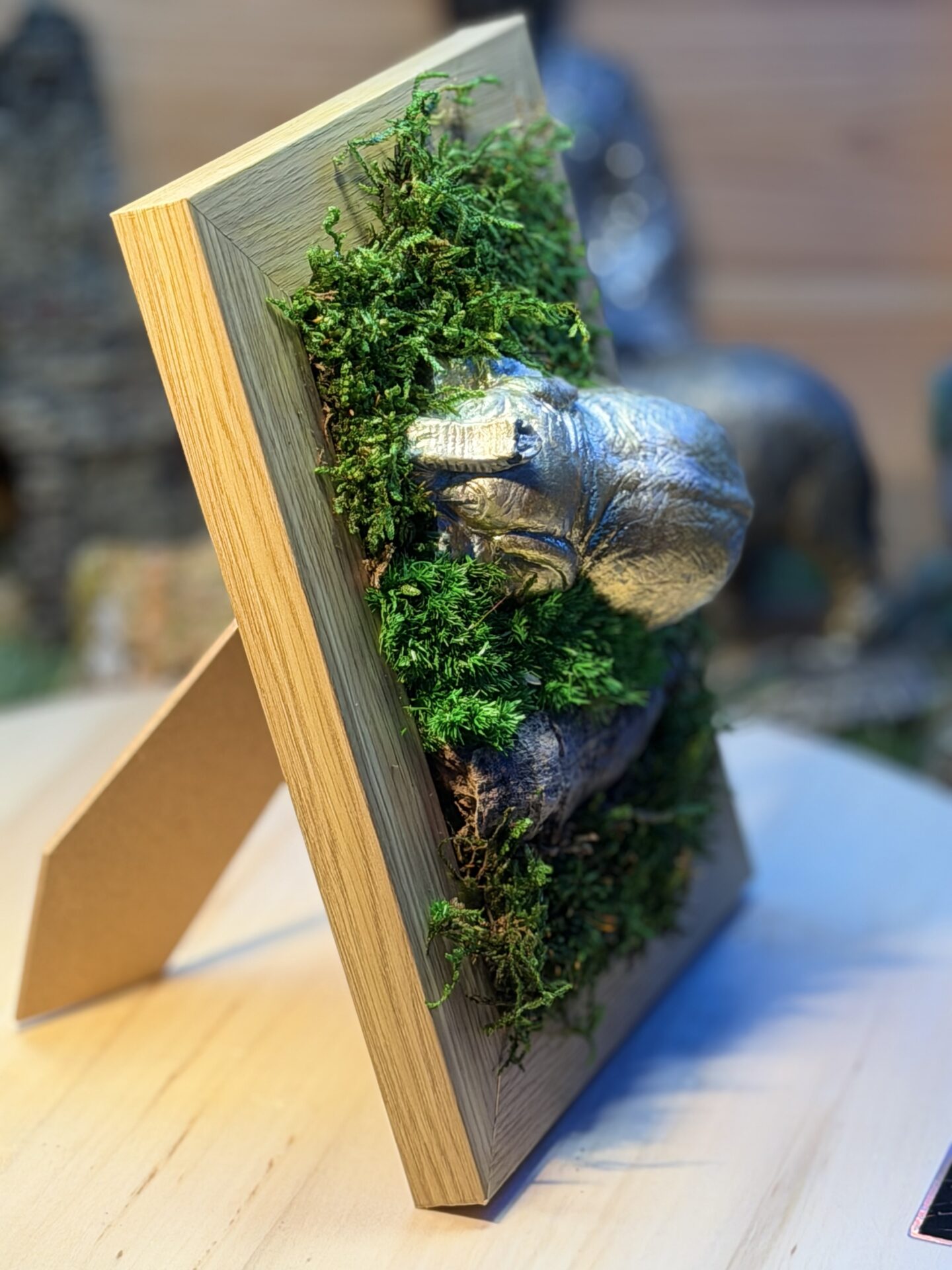 The image shows a decorative art piece mounted on a wooden board. The centerpiece of the artwork is elephant figurine, depicted in a reclining position. The figurine is surrounded by lush green moss, which adds a natural and organic element to the composition. Below the elephant there is a piece of textured bark, enhancing the earthy aesthetic. The overall setting appears to be indoors, with the background slightly blurred, focusing attention on the art piece itself.