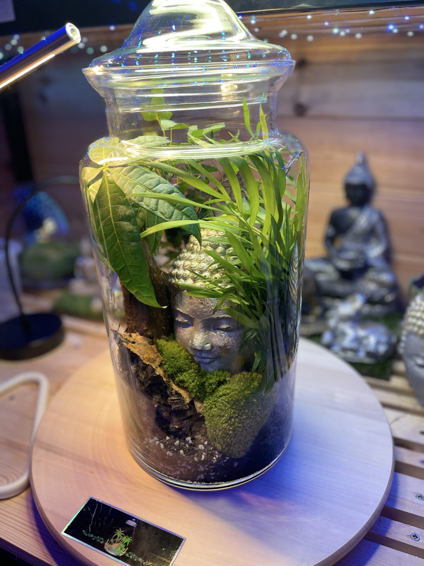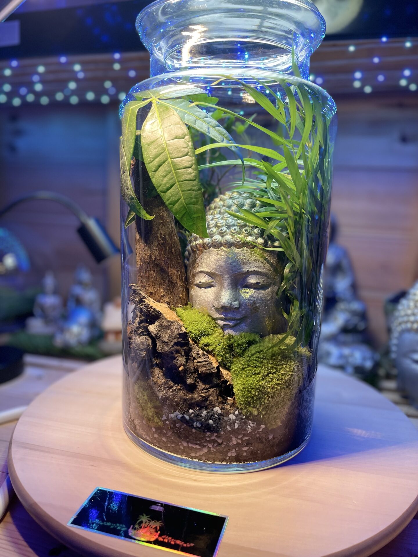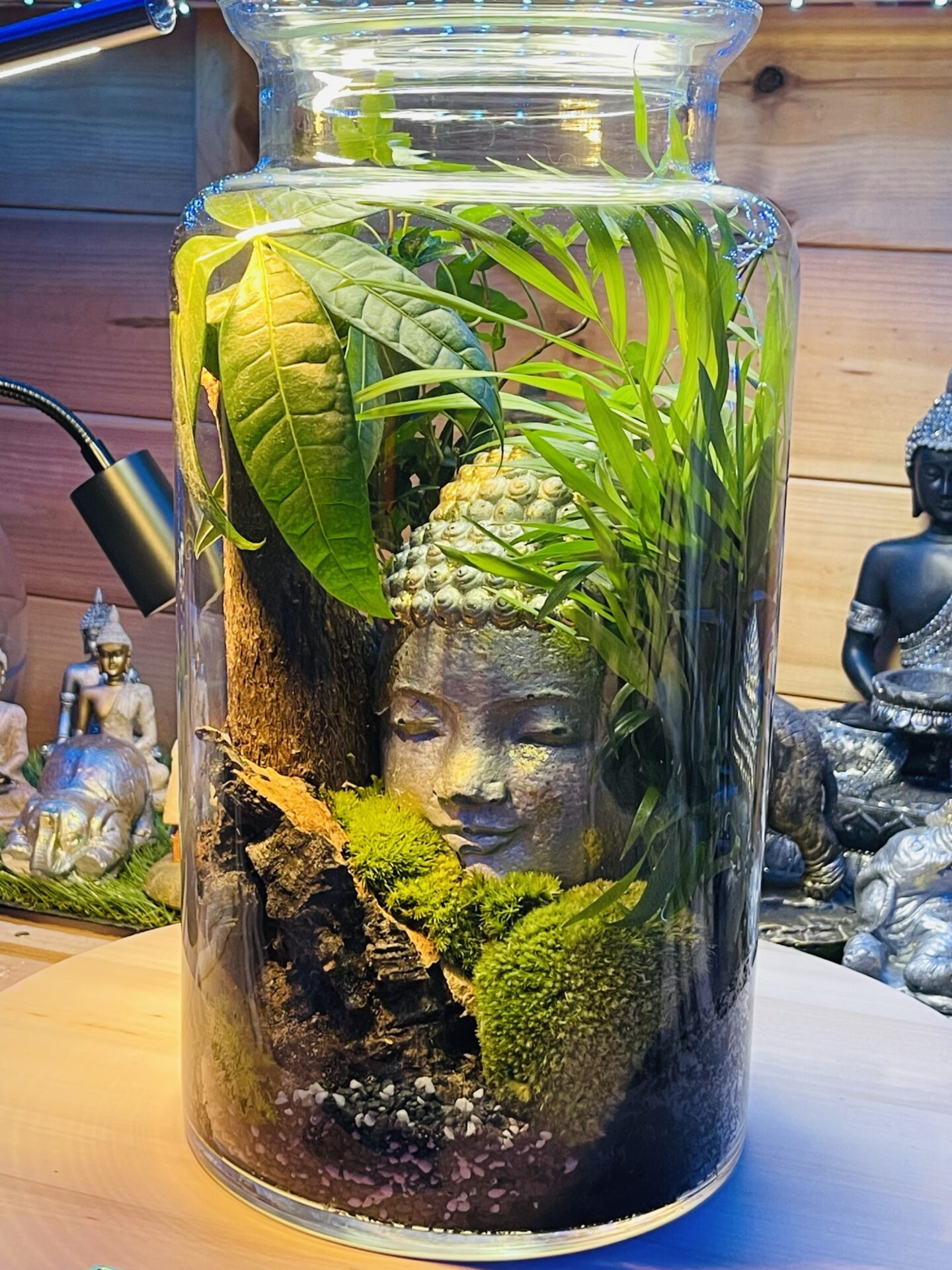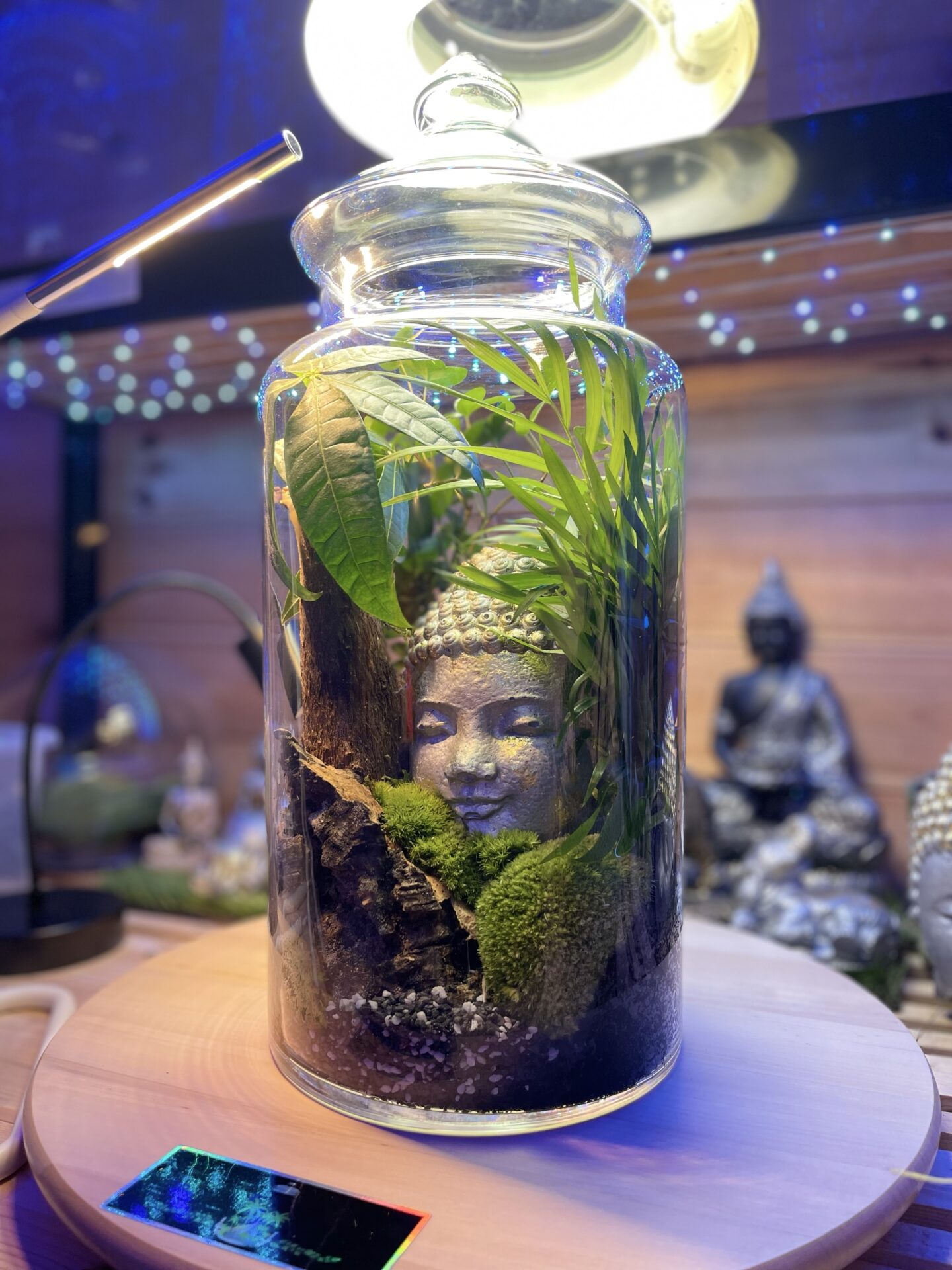 Inside the jar, there is a serene Buddha head sculpture surrounded by lush, green plants. The plants include various types of foliage, such as ferns and moss, which create a miniature, tranquil garden environment around the Buddha. Buddha statues, adding to the overall peaceful and meditative atmosphere of the setting.